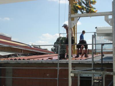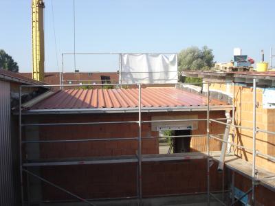 Dach ist drauf, Wasser und Elektro Rohinstallation verlegt und wir haben jetzt Fenster und ein Garagentor: